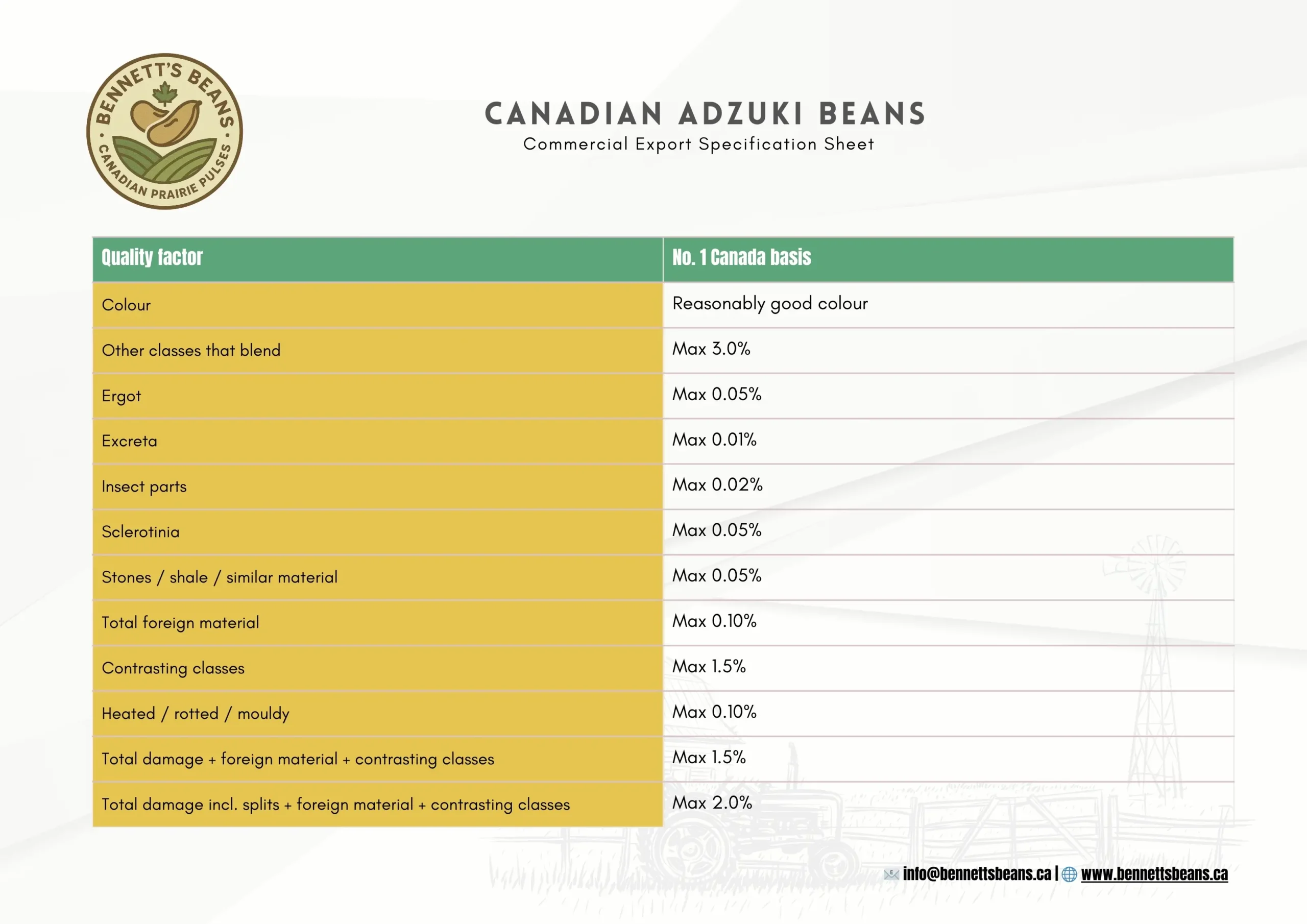 Before every shipment, each lot of Bennett’s Beans Adzuki Beans passes a five-stage inspection that meets both CFIA and FDA import standards: