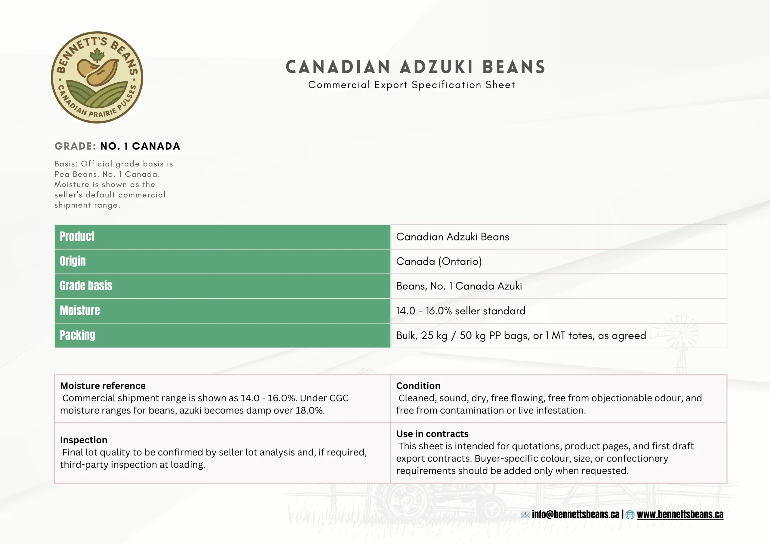 Bennett’s Beans supplies Canadian adzuki beans for importers, wholesalers, and food manufacturers. We confirm specifications per lot (moisture, purity, sizing, and defect tolerances) against the buyer’s requirements. We also coordinate packaging and documentation based on destination-market requirements.
